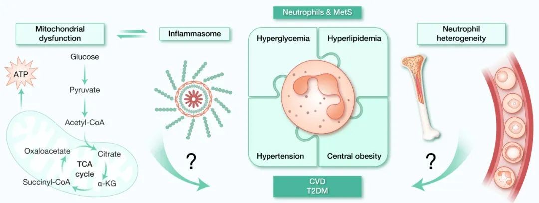 As the core pathological basis of type 2 diabetes mellitus (T2DM) and cardiovascular disease (CVD), metabolic syndrome faces the dual challenges of long-term health damage and economic burden. Studies have confirmed that chronic inflammation of adipose tissue (AT) is a key early driver of metabolic syndrome, often preceding obesity and T2DM. As the core regulatory node of the inflammatory network, neutrophils have been shown to be deeply involved in the process of metabolic diseases in both human and animal models: they can directly disrupt metabolic homeostasis by releasing inflammatory factors and regulate the balance of the immune-metabolic axis through phenotypic transformation. However, there are still significant gaps in the understanding of neutrophil transcriptional plasticity and subset heterogeneity, especially in the process of physiological-pathological state transition, the dynamic interaction mechanism between mitochondrial metabolic reprogramming and inflammasome activation still needs to be deeply revealed (Figure 4).