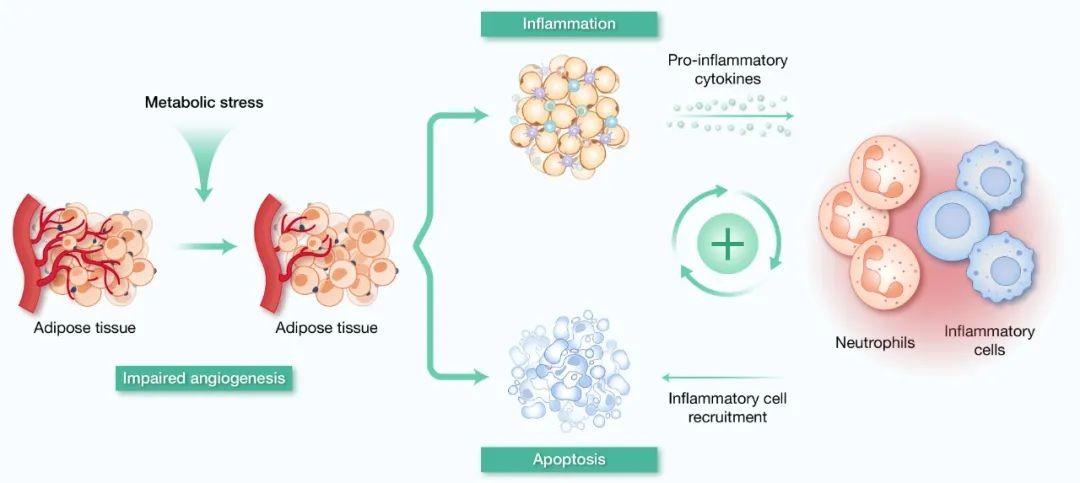 As a metabolic disorder caused by excess energy, the pathological core of obesity lies in abnormal expansion and dysfunction of adipose tissue (AT). Due to its anatomical location close to metabolic regulation hub organs, its excessive accumulation can exacerbate systemic metabolic disorders through abnormal endocrine function: the secretion of pro-inflammatory factors such as tumor necrosis factor-α (TNF-α) and interleukin-6 (IL-6) in AT in obese individuals increases, while the level of adiponectin, which has insulin sensitizing effects, decreases, and this adipokine imbalance is directly involved in glucose intolerance and insulin resistance. At the same time, AT will adapt lipid storage through adipocyte hypertrophy and proliferation to cope with overnutrition, but rapid expansion is often accompanied by angiogenesis lag, leading to tissue hypoxia, cell death, and waterfall release of pro-inflammatory factors, forming a chronic low-grade inflammatory microenvironment (Figure 3). Neutrophils play a key mediating role in this pathological process, and their interaction with adipocytes constitutes a vicious cycle of obesity-related metabolic disorders. In the early stage, neutrophils are recruited to AT and destroy key molecules of the insulin signaling pathway by releasing elastase, while promoting macrophage infiltration to exacerbate inflammation. Free fatty acids produced by adipocyte lipolysis enhance neutrophil-macrophage crosstalk through leukotriene B4-dependent mechanisms. Notably, there are species-specific differences in neutrophil-mediated AT inflammation: mouse models show non-NLRP3-dependent IL-1β upregulation, while human studies confirm that NLRP3 inflammasome activation is directly involved in AT fibrosis progression. The complexity of this metabolic-immune interaction network suggests that targeted neutrophil metabolic reprogramming may be a new strategy for improving obesity-related metabolic syndrome.